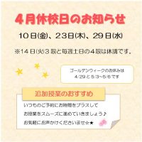 皆様、こんにちは。 ときどき夏のような暑さを感じますね… 長袖をだしたりしまったり、戸惑う今日この頃、 いかがお過ごしでしょうか? 今日は、このような状況で、 教室を休むことを余儀なくされている皆様に…