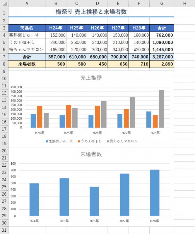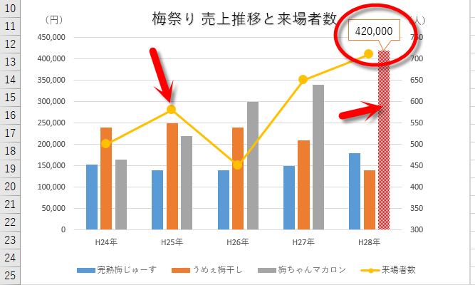 折れ線グラフの色を変更したり、一部の棒グラフの色を違う色や柄にするだけでデータを強調することができます!グラフに図形を挿入してもいいですね!