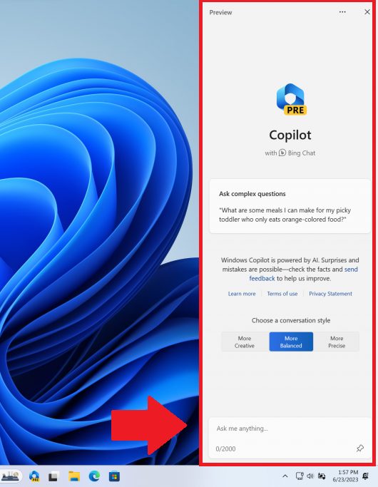 前回の記事では、マイクロソフト社が開発中の新機能「Windows Copilot」について詳しくご紹介しました。これは、AI技術を活用してWindowsの操作をサポートする画期的な機能です。音量や画面の明るさの調整、メールの送信、PDFの要約、音楽の再生など、様々な操作をWindowsに搭載されたAIがサポートしてくれる機能です。また、冒頭で触れたChatGPTと同じように、何かについて質問をすれば答えてくれます。