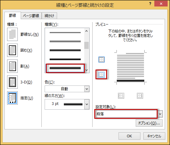 ③罫線の種類を選択して、[設定対象]を[段落]にし、罫線を引く位置をクリックして[OK]をクリックします。
