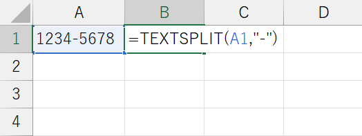 例えばA1セルのデータを「-」で分割したい場合は「=TEXTSPLIT(A1,”-“)」と指定します。