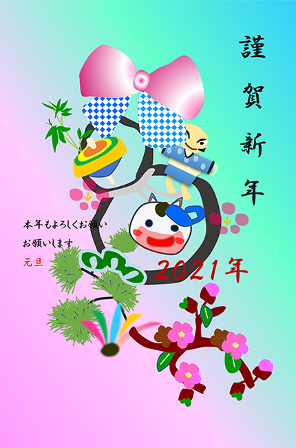 素材集とテキストボックスを組み合わせて作った作品です。年賀状作成イベントに参加頂き完成させた作品ですが、事前に設計図を書いてきて下さり自慢の力作です。