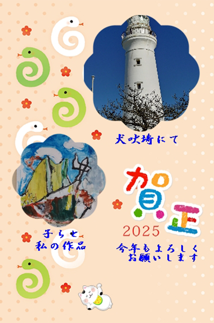 Wordお絵描きで作成したイラストを活用しPowerPointで作成されました。PowerPointならではの図形の接合を使ってヘビのオリジナルの図形を作成されました。これまで作成された水彩のイラスト背景に添えたりと作品を組み合わせることで、より豪華な年賀状を作成することが出来ました。