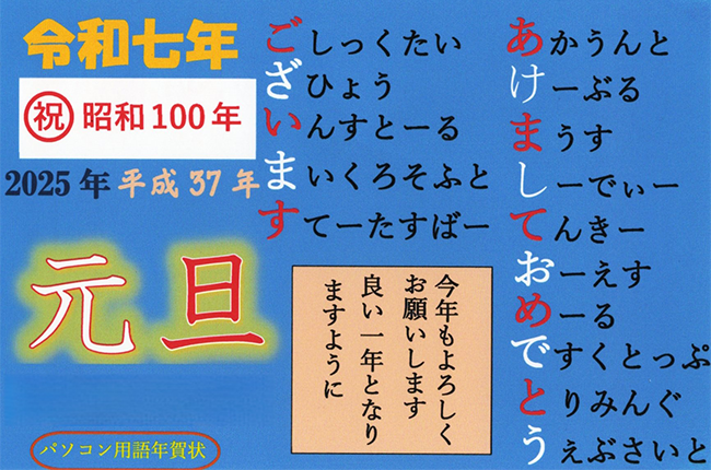 今年はなんとWordでパソコン用語年賀状を作成されました!テキストの索引などを参考に、あいさつ文に当たる頭文字の単語を探したそうです!紅白色もおめでたい雰囲気が出ていて素晴らしいです!頂いた方も勉強になりますね(^▽^)/