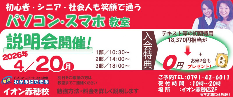 イオン赤穂店の2階にあり、交通に便利です。 小学生から80代の方まで、パソコン初めてさん・仕事に活かしたい方・資格を目指される方等、いろいろな目的を持ったたくさんの生徒様が通っていらっしゃいます。 こんな事がしたい、できるかな? と迷っていらっしゃる貴方。 今が始め時です。さあ、私たちと一緒に始めましょう!!