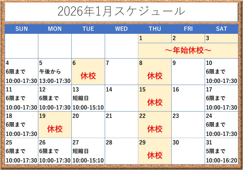 ・他に休校・短縮授業は月のご予約表をご確認下さい
