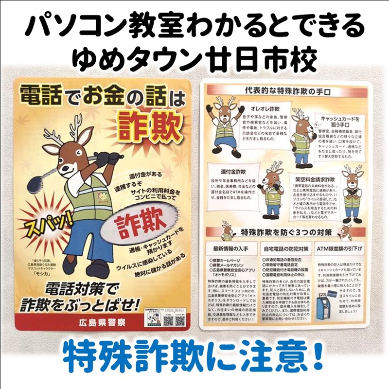 今朝、ゆめタウン廿日市で警察の方が特殊詐欺防止のチラシを配っておられたので、