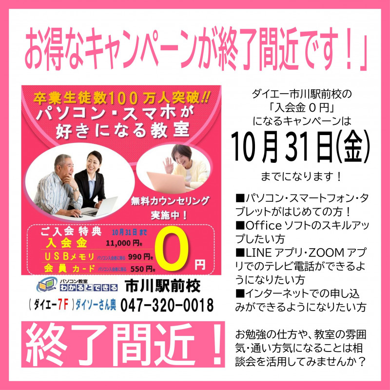 (この記事は2025年9月26日に更新されました) ダイエー市川駅前校で実施した、9月個別説明会へのご参加ありがとうございました。 「全く初めての方」「パソコン・スマートフォン経験者」の…