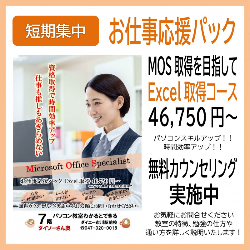 市川市JR市川駅より徒歩1分 ダイエー市川店7Fで開校しております。スマートフォン・パソコン初心者の方やご年配の方から、ビジネススキルアップ・パソコン資格取得を目指される方まで、学ぶ事ができる教室です。他にも、新しい生活様式に合ったネット通販、オンラインサービスを利用したZOOM・診療、テレワーク、各種アプリが学べます。笑顔が絶えない教室で学習しませんか?ご来校お待ちしております!!