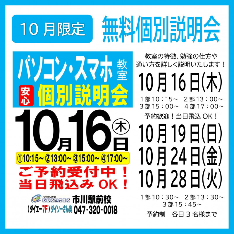 (この記事は2025年9月26日に更新されました) ダイエー市川駅前校で実施した、9月個別説明会へのご参加ありがとうございました。 「全く初めての方」「パソコン・スマートフォン経験者」の…
