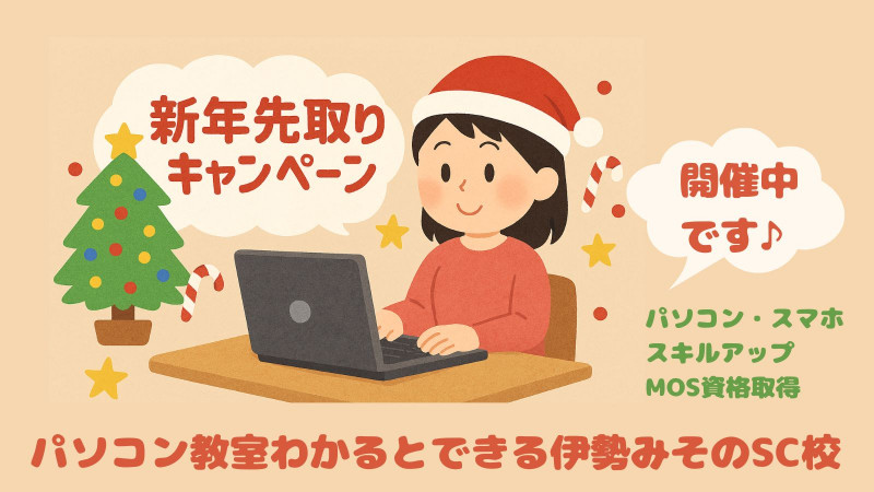 こんにちは! パソコン・スマホ教室わかるとできる 伊勢みそのSC校です。 いつも当教室をご利用いただき ありがとうございます。 当教室は誠に勝手ながら、 以下の期間を 休業…