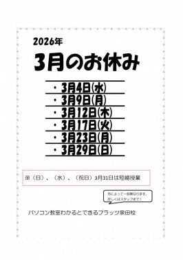 さて、3月の休校日をお知らせします。