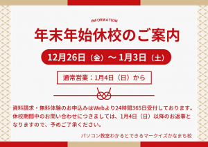 葛飾区金町周辺にお住まい&通勤・通学されている皆さま、こんにちは! パソコン教室わかるとできる マークイズかなまち校です! 📅今月の教室カレンダー 1月の教室カレンダーをご案内いたします。  …