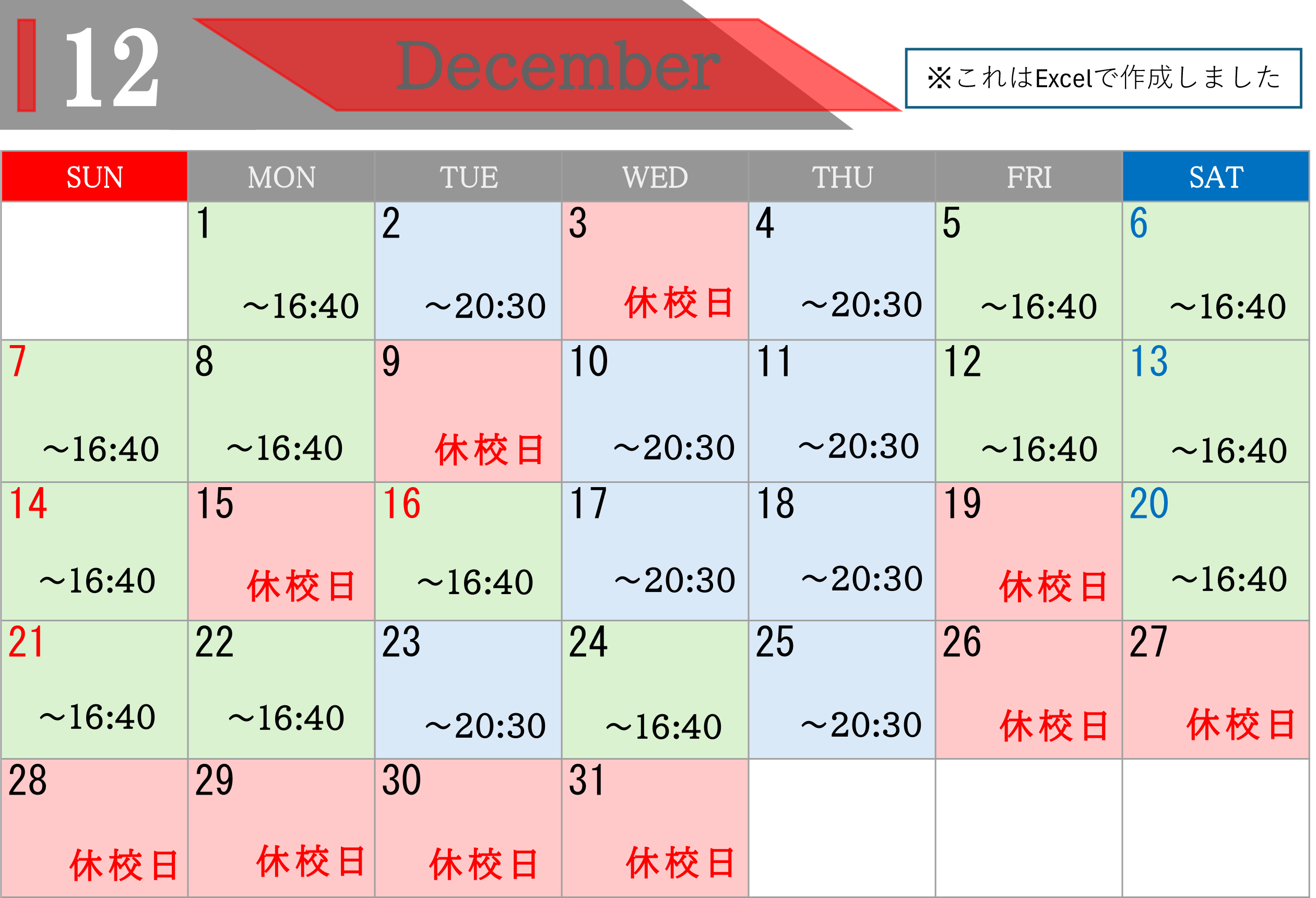 【information】📅12月の教室カレンダー