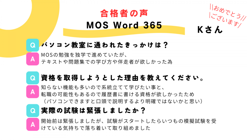 今回のブログは、MOS試験に合格された生徒様のご紹介です。