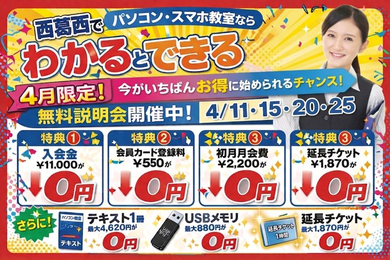 【入会金:無料‼】西葛西でパソコン教室を探している方へ|今からでも遅くない“はじめ時”です