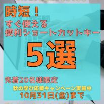 時短!すぐ使えるWindows便利ショートカット5選 2025年10月13日 便利機能のご紹介みなさん、こんにちは!インストラクターの吉留です。 「作業が遅くてイライラする…」そんな経験、ありませんか? 実はパソコンには、“ショートカットキー”という便利な仕組みがあります。今回は、初心者でもす… つづきを読む