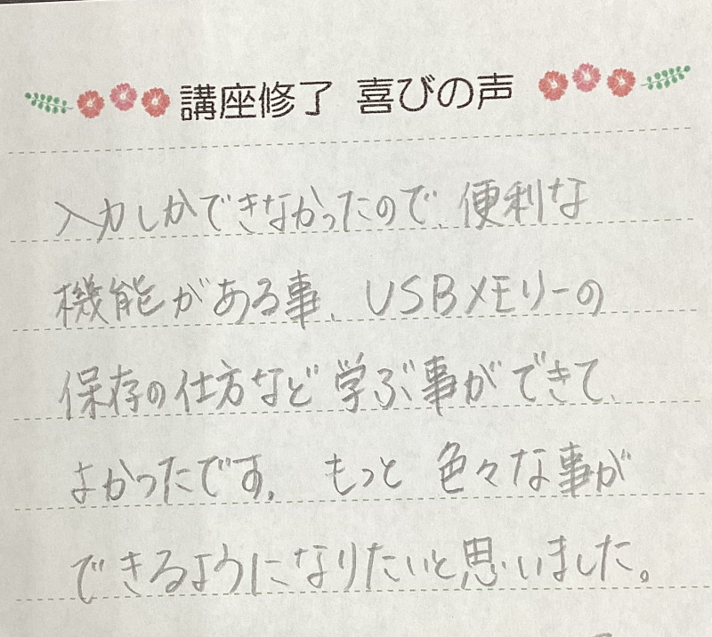 生徒様の声 ♪2025-07-14 その他 , 生徒様のご紹介皆様こんにちは!今日は生徒様のお声を紹介します。ご入会されたばかりの生徒様で、Windows11導入、基本操作編を修了のご感想です。今はWord入門編に進み、さらに様々な文書に挑戦中!これからも楽しんで下さいね〜。皆様も是非! パソコンは触ったことない!という方でも大歓迎!電源の入れ方から習えます。お問合せはメール、またはお電話にて!入会までの流れはこちらをクリック!この記事をシェアする:FacebookTwitterお気軽にお申込みください!無料体験を申込む資料請求&お問合せ « 前の記事へ 次の記事へ »