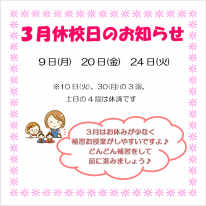 今月の休校日をお知らせいたします! 休校日以外の日であれば、教室の見学や無料体験をしていただくことができます!ブログを見て教室にお越しいただいた方は、ブログを見ました!とスタッフに伝えてください。今な…