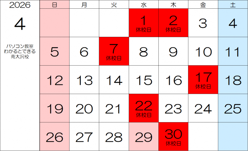 4月休校日:1日(水)2日(木)7日(火)17日(金)22日(水)30日(木)