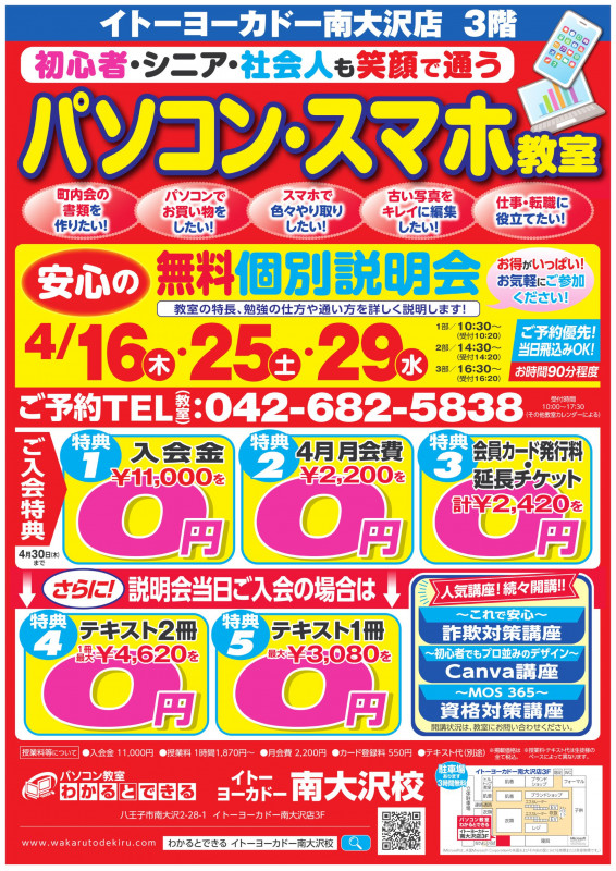 みなさんこんにちは! パソコン教室わかるとできる南大沢校では、「無料個別説明会」を開催いたします! 教室の特徴、勉強の仕方や通い方を詳しく説明し、目的に沿ってカリキュラム相談ができますので この機会に…
