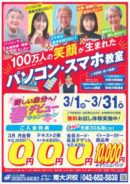 パソコン教室イトーヨーカドー南大沢校はイトーヨーカドー南大沢店3Fにございます。八王子市・町田市・相模原市・南大沢周辺でパソコン教室・スマートフォン・タブレット教室なら当教室にお任せ下さい!初心者の方、スキルアップ、パソコンの資格取得も目指せます。お気軽にお問合せください。