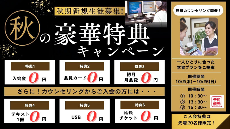秋も深まり、年末が少しずつ見えてくる季節になりましたね。 「そろそろパソコンをしっかり身につけたい」「仕事に活かせるスキルを学びたい」 そんな方にぴったりの 入会金無料キャンペーン が、いよいよ 10…