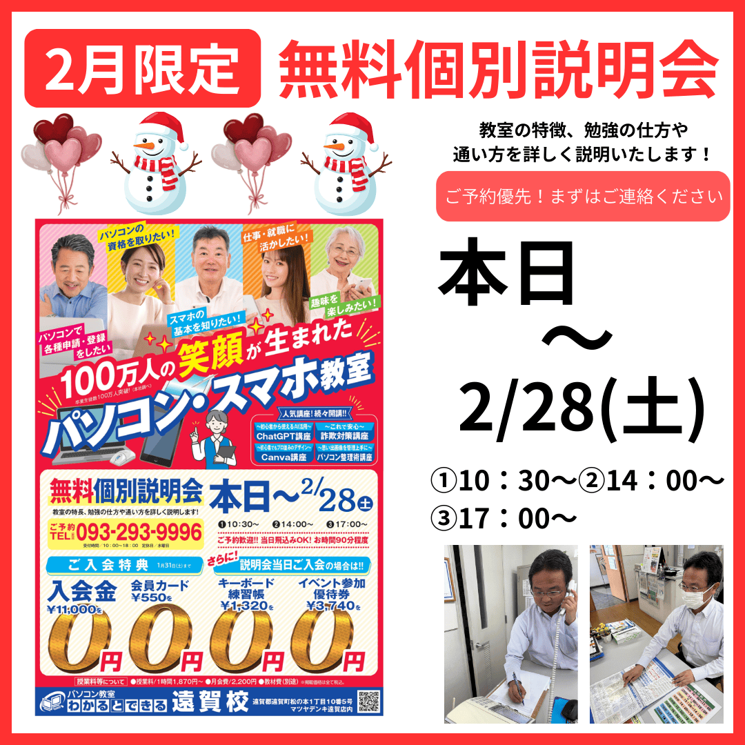 こんにちは😊わかるとできる遠賀校です! 寒さが続く2月ですが、「今年こそパソコンやスマホをしっかり学びたい!」そんな方にピッタリのご案内です💻📱 現在、2月限定で無料個別説明会を開催中! 初心者の方か…