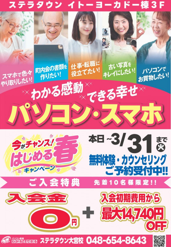 「パソコンを買いたいけど使えるのか不安」という初心者の方から、「パソコンの資格をとって就職に役立てたい」という上級者の方まで、安心してあなたの「やりたい」を実現できます。