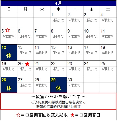 4/12(日)、4/26(日)、4/29(水) が休校日となります。