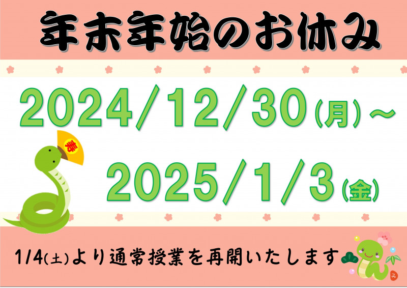 12月30日〜1月3日は休校となりますので、教室へのご来校やお電話、Web等からのお問合せには対応できません。