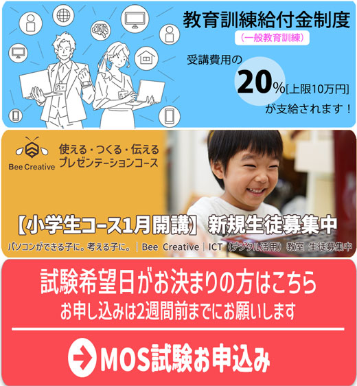 パソコン資格の取得を目指すならMOS対策講座がオススメ。試験合格はもちろん、実務で役立つスキルが身に付きます。