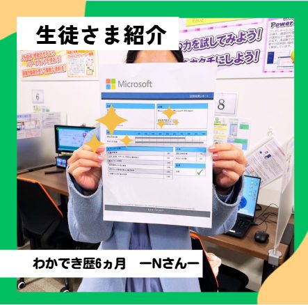 Nさんは2026年9月にご入会、わかでき通学歴は約6ヵ月です。今後の就職のためにWordとExcelの資格を取りたい!とご入会されました。