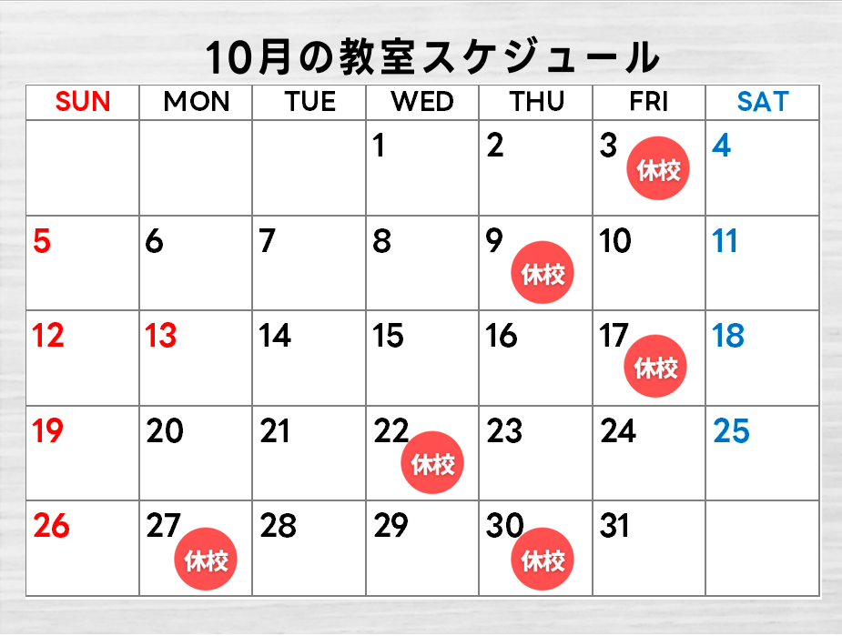トコトコスクエア所沢校の2025年10月の休校日をご案内いたします。