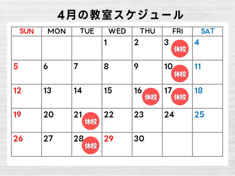 トコトコスクエア所沢校の2026年4月の休校日をご案内いたします。