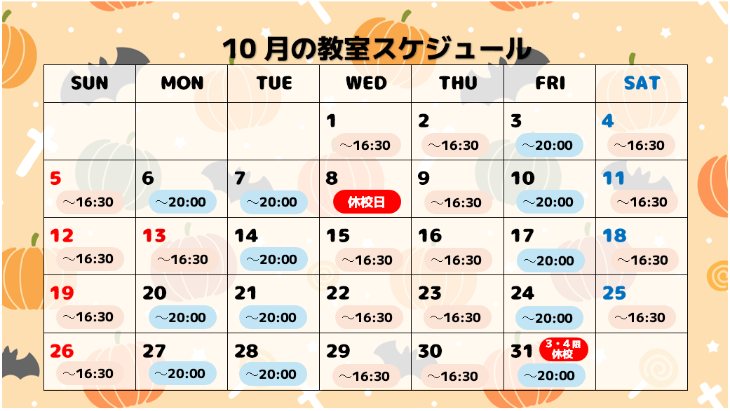 みなさんこんにちは(^^)/ 2025年10月の空席状況&休校情報をお知らせいたします! 【通学中の生徒のみなさんへ】 振替や追加の際の空席情報を参考にしてください♪ 予約・振替・追加の…