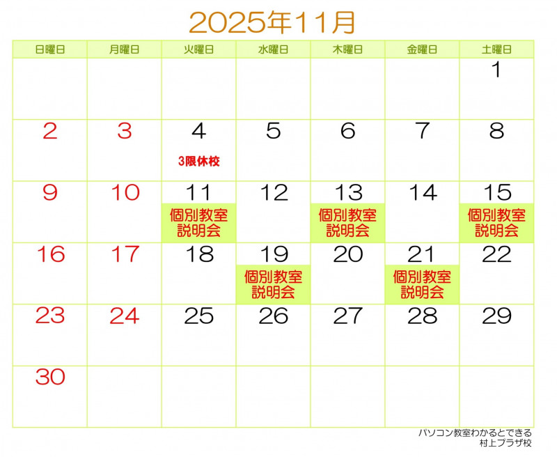パソコン教室わかるとできる村上プラザ校では、11月29日(土)まで、『今年最後の大感謝キャンペーン』を開催中です! 来年にむけてパソコンが必要になる方は今が今年最後のチャンスです! この機会をお見逃し…