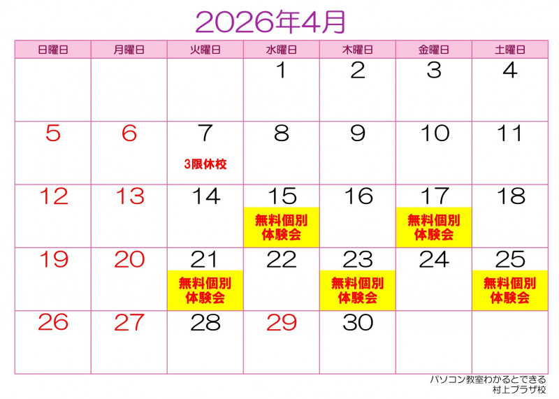 <4月開校カレンダー>