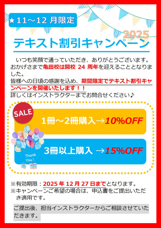 そこで日頃の感謝を込めまして、期間限定ではありますが「テキスト割引キャンペーン」を開催させていただきます! (^^)/