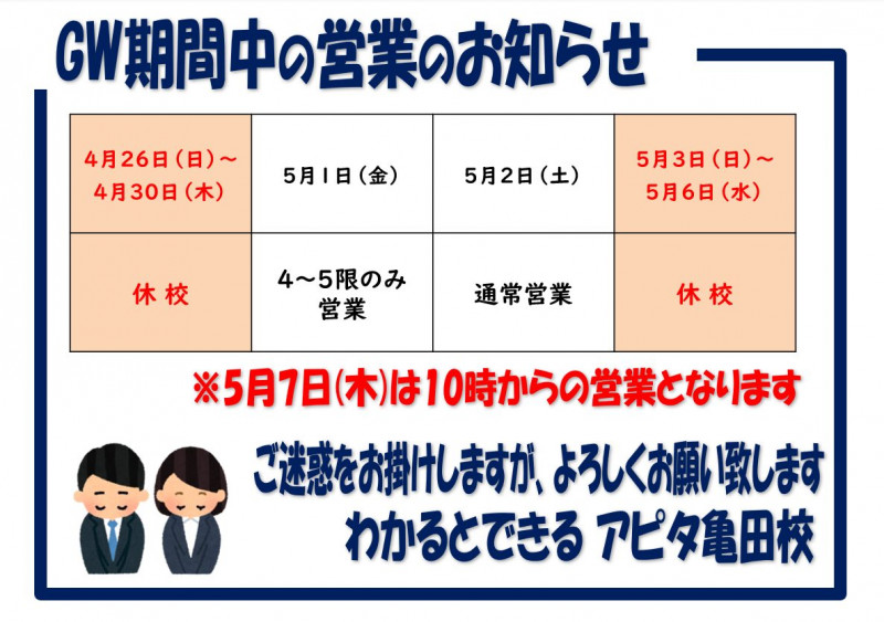 私たち「アピタ亀田校」は明日(26日)からGWの休校期間に入ります。