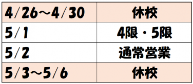 5月1日は4・5限のみの営業となりますのでお気を付けください。